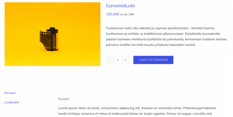 Verkkokaupan toiseksi tärkein osuus, eli itse myytävät tuotteet ja palvelut, on hyvä kuvata mahdollisimman tarkasti sivuille kuvin ja kirjoitetuilla kuvauksilla. Tuotekuvien tulisi olla selkeitä ja sopivan yksinkertaisia – kiinnitä huomio tuotteeseen ja esittele se todellisessa ulkoasussaan. Kirjoitetulla kuvauksella pääset luomaan mielikuvia tuotteista tai palveluista, kertomaan tuotteen tarinan, palvelun sisällön tai mitä muuta yrityksesi haluaakin viestiä. Parasta verkkokaupassa on, että alkuun pääsee jo pienellä valikoimalla, ja kaupan voi avata vaikka vain yhden tuotteen voimin. Tai sitten voit heti lisätä sivukaupalla tavaraa. Tuotteiden lisääminen on viimeistään muutaman yrityksen jälkeen helppo homma.